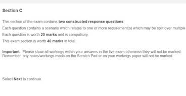 每个部分的总结界面会确认总共有多少道主观题(比如说 2 道或者 3 道)以及每道多少分值。在题目的上方会提示有多少个要求和案例/问题相关。