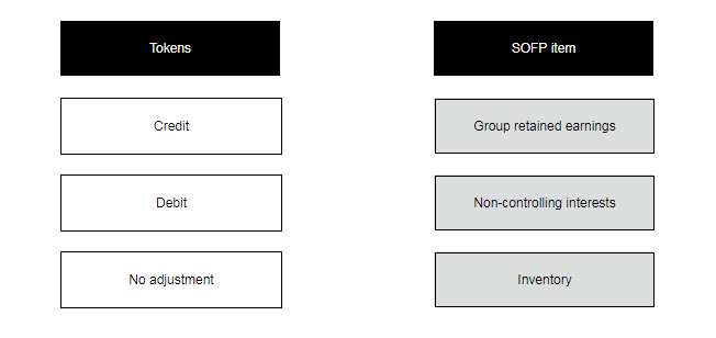 Match the tokens to the appropriate item in the statement of financial position (SOFP) to reflect the adjustment required in the consolidated statement of financial position to eliminate any unrealised profit in inventory.