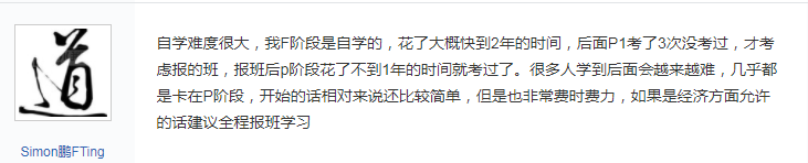 引用网友的一段描述说:自学难度很大,我F阶段是自学的,花了大概快到2年的时间,后面P1考了3次没考过,才考虑报的班,报班后p阶段花了不到1年的时间就考过了。很多人学到后面会越来越难,几乎都是卡在P阶段,开始的话相对来说还比较简单,但是也非常费时费力,如果是经济方面允许的话建议全程报班学习。