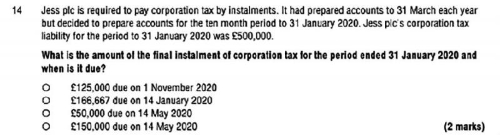 Jess这里the first three instalments的数额是3/10 *£500000 =£150000,the final instalment倒计时的分期付款是£500000 –(3*£150000)=£50000,在下一个会计期间的第四个月的第14天到期:due on the 14th day of the fourth month of the next accounting period。