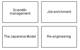 Job design一般分四种:scientific management, job enrichment, the Japanese model and re-engineering.