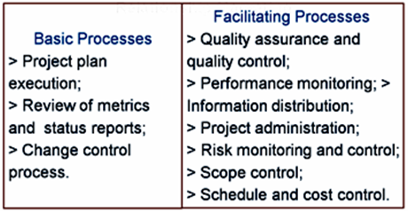 基本流程包括计划、监督衡量、更改项目管理流程;促进流程包括质量保证和控制、项目监管、风险把控、成本控制等等。