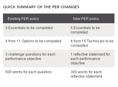 在成为ACCA会员之前需要完成的一些不可忽略的一些东西或要求,其中有一样就是PER(Practical Experience Requirement),它是你成为会员道路上不可或缺的一部分,这就是实践工作经验。此项目需要36个月的实践工作时长的要求,包括相关会计领域的工作。从2016年2月开始,ACCA推出了新的PER policy,新的PER要求需要完成5个Essentials;完成15选4的Technical;对每一个performance objective需要写一个reflective statement,每个statement需要300字左右。具体的变化可参考下面官网截图。