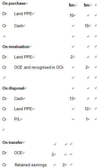 IAS 16 PPE is one example of a standard that prohibits gains and losses to be reclassified from equity to P/L as a reclassification adjustment. If we consider land that cost $10m which is treated in accordance with IAS 16 PPE. If the land is subsequently revalued to $12m, then the gain of $2m is recognised in OCI and will be taken to OCE. When in a later period the asset is sold for $13m, IAS 16 PPE specifically requires that the profit on disposal recognised in the P/L is $1m – ie the difference between the sale proceeds of $13m and the carrying value of $12m. The previously recognised gain of $2m is not recycled/reclassified back to P/L as part of the gain on disposal. However the $2m balance in the OCE reserve is now redundant as the asset has been sold and the profit is realised. Accordingly, there will be a transfer in the Statement of Changes in Equity, from the OCE of $2m into RE.