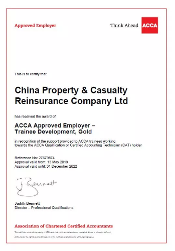 2019年6月3日,中国财产再保险有限责任公司获得ACCA(特许公认会计师公会)黄金级培训生发展类与专业发展类认可雇主资格。
