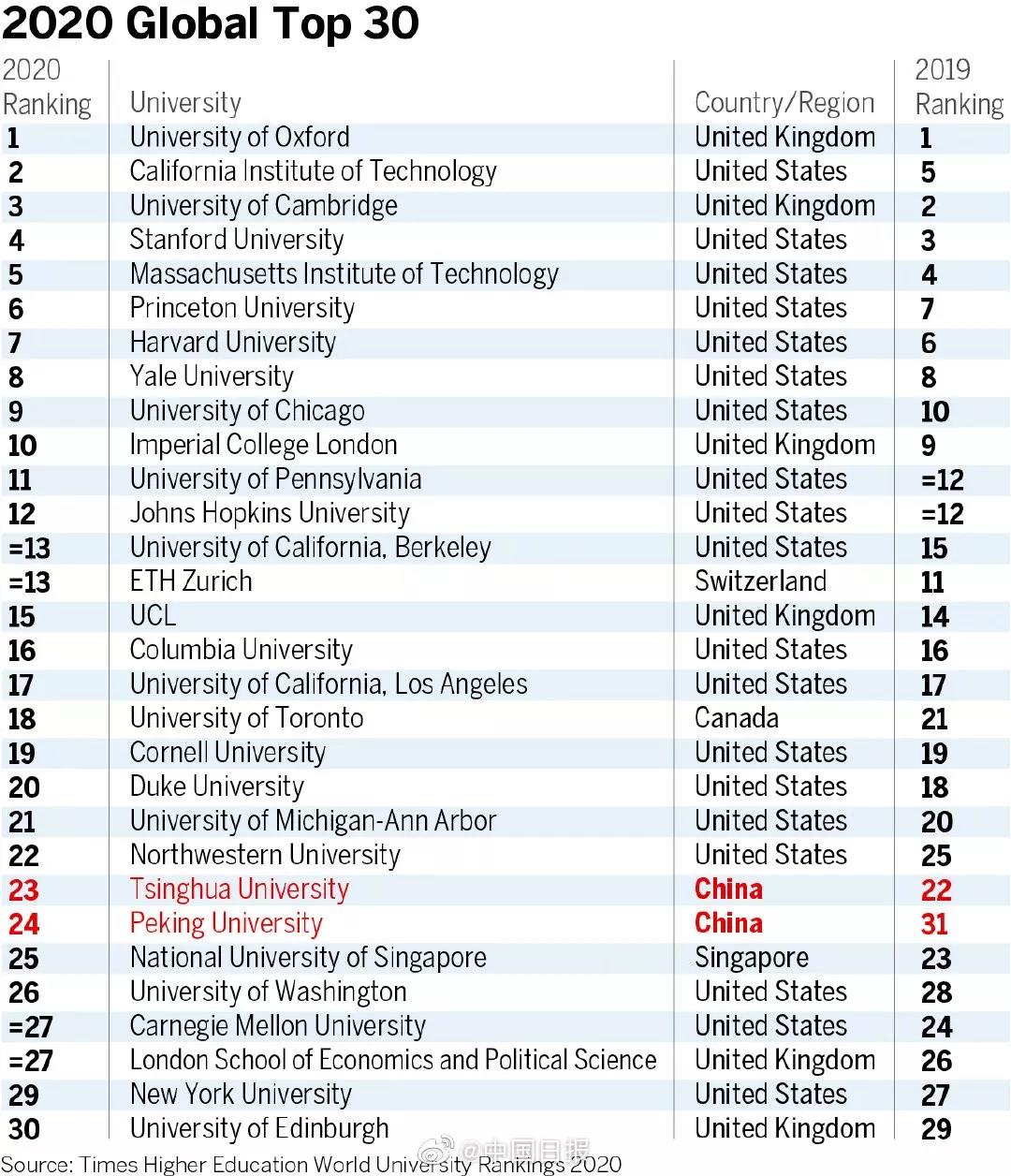 据发布的泰晤士高等教育世界大学排名显示,清华大学和北京大学分列23和24位,首次包揽亚洲高校前两位。