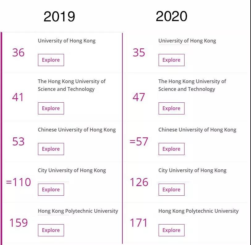 香港大学由36名上升到35名;香港科技大学由41名降到47名;香港中文大学由53名降到57名;香港城市大学由110名降到126名,香港理工大学由159名下降到171名。