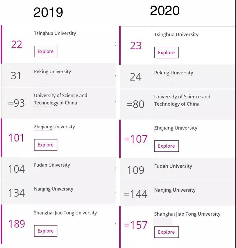 中国共有13所高校进入榜单前200,其中中国内地(大陆)有7所,中国香港有5所,中国台湾有1所。日本只有东京大学和京都大学跻身排名前200。