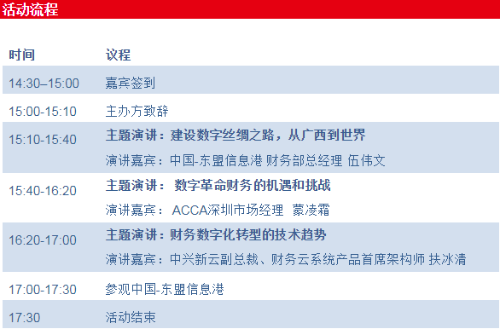 为此,ACCA联合中兴新云,一同于2019年10月31日在南宁举办主题为——“走进中国-东盟信息港,共研财务数字化转型”论坛活动,并邀请中国-东盟信息港财务部总经理、ACCA财务专家、中兴新云首席架构师,共同探讨数字化革命财务的机遇和挑战,并参观中国-东盟信息港。