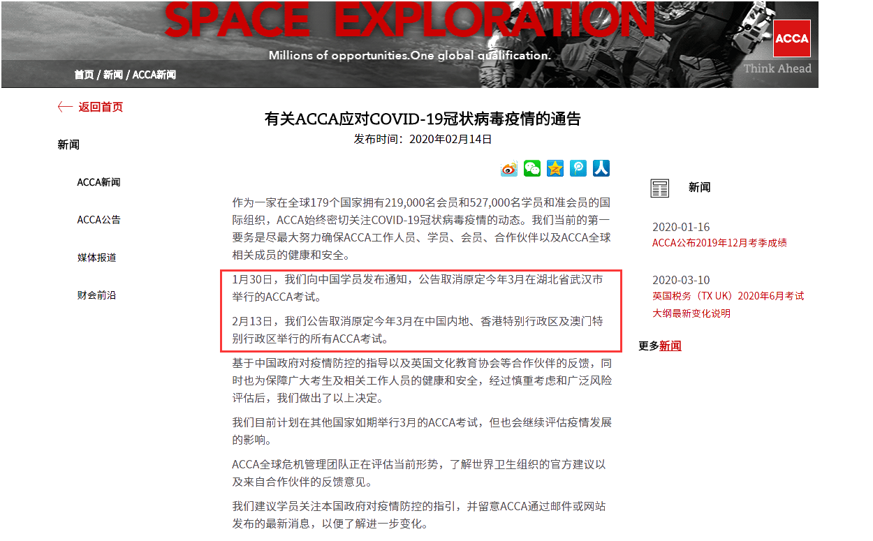 2020年3月,由于新型冠状病毒在全中国地区的肆虐,ACCA官方不得不相继取消了3月考季武汉乃至全中国地区的ACCA考试,并将所有报考费用返还到已报名考生的myACCA账号中。