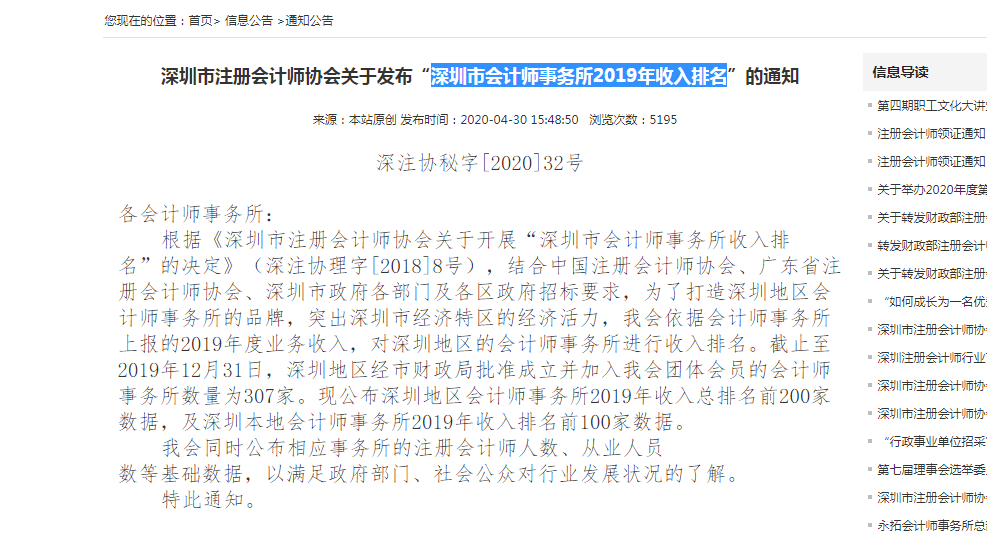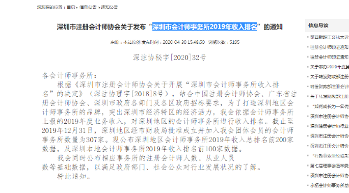 深圳市注册会计师协会关于了发布“深圳市会计师事务所2019年收入排名”的通知。通知指出,截止至2019年12月31日,深圳地区经市财政局批准成立并加入团体会员的会计师事务所数量为307家。现公布深圳地区会计师事务所2019年收入总排名前100家数据公布如下: