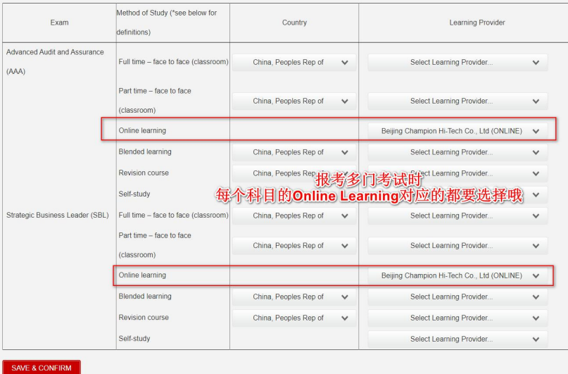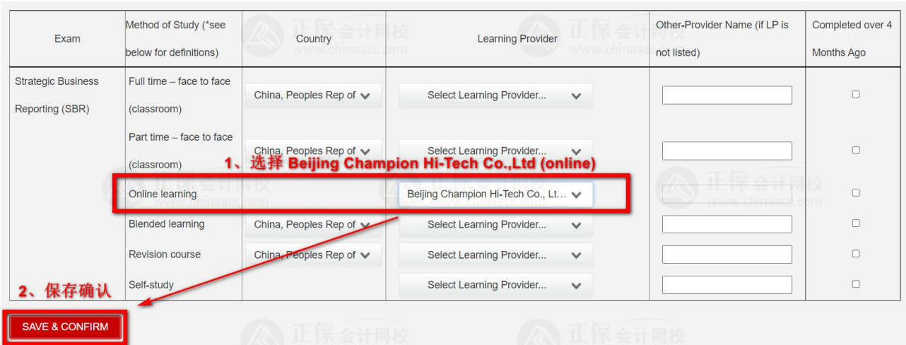 3、进入到下面这个位置时,按照红框中的内容选择(每科都要对应的选)即: Online learning→Beijing Champion Hi-Tech Co. Ltd.Dist...→Save & Confirm