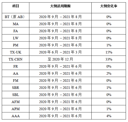 ACCA官方已正式发布2020年-2021年考试大纲,本次考纲变动涉及了PM、TX、AA、SBR以及AAA等七大科目。本年度考纲变化率如下所示: