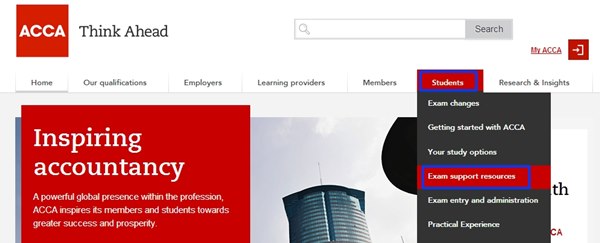 ◆1.进入ACCA英文官网(),点击student,找到Exam support resources进入。