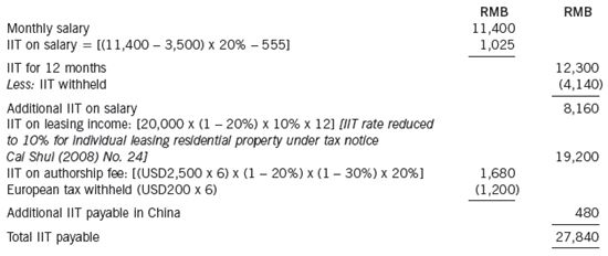 (c)Mr Huang is a China tax resident who has to file an annual individual income tax (IIT)return for 2015. His income and IIT withholding status for 2015 are as follows: