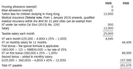 Calculate the total individual income tax (IIT)payable by Ms Wu on her employment income for 2015 on the assumption that Ms Wu qualifies for all possible tax incentives allowable under the IIT rules.
