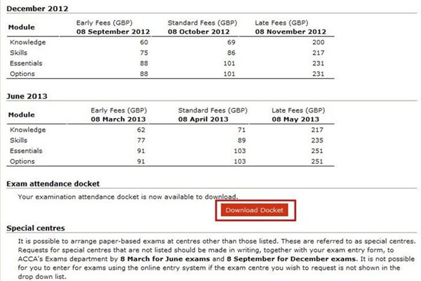 3、进入考试信息页面,在Exam attendance docket中点击Download Docket,确认准考证信息无误后,下载并打印PDF准考证即可:户后点击左侧的EXAM ENTRY: