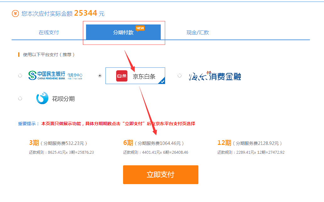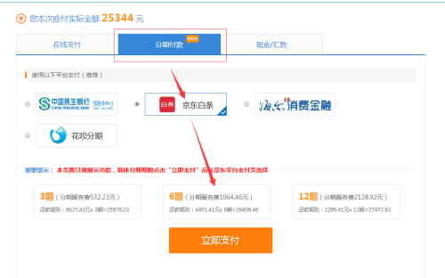 第三步:进入支付页面,点击分期付款,选择京东白条,选择6期支付,即可享受6期免息福利。