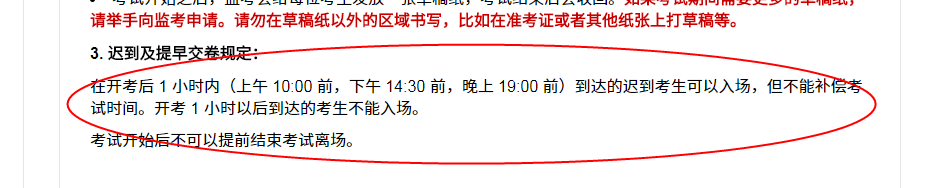 ·在开考后 1 小时内(上午 10:00 前,下午 14:30 前,晚上 19:00 前)到达的迟到考生可以入场,但不能补偿考试时间。开考 1 小时以后到达的考生不能入场。
