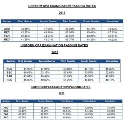 以下是正保会计网校2013年美国CPA各科考试通过率统计: