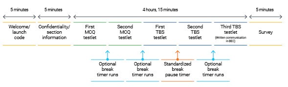 四门考试科目的每一科目都分为五个部分,称为testlet。 这些testlet具有多项选择题(MCQ)和案例模拟(TBS)。 对于BEC,还必须完成三个写作题。MCQ和TBS的数量取决于具体的测试科目。在AUD,FAR和REG部分将至少有一个research-oriented TBS。 要完成它们,考生必须搜索相关的文献并找到适当的参考。