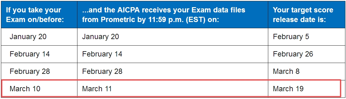 2. 一般情况AICPA考试成绩都会在指定日期发布,但是不能保证一定是在指定日期公布;