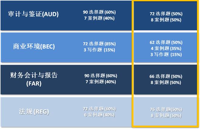 除了BEC之外,其他三科的题型没有大的调整,只是MCQs和TBS的占分比重,由原来的60%-40%变为了50%-50%。不过题目数量上还是有所变化的,我们可以看到AUD和FAR的MCQs减少了20多道题目,Simulation分别增加了1题,由于考试时间没有变化,因此对于考生们来说,改革后的AUD和FAR简直就是福音!!!