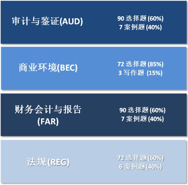 从上图可以看出来,除了BEC以外,其他三科选择题(Multiple-Choice Questions_MCQs)占了60%的分数,而案例题(Task-Based Simulation_TBS)占了40%的分数。BEC这一科比较特别,只有选择题和写作题,分数的比重分别是85%和15%。