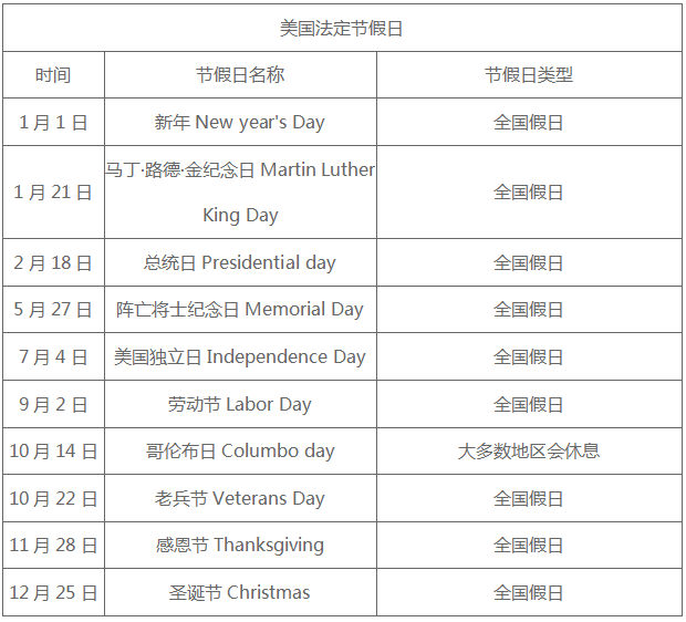 美国一共有50个州、一个特区。在休假安排方面,除重大传统节日(比如圣诞节、感恩节等)和国家级纪念日(如独立日)这样的联邦假日之外,很多州还会单独安排一些纪念日,或者虽然在同一天休假,却有着不同的主题和文化,从而在休假安排方面体现出现较大差异。为避免混淆和难以查找,本着从众原则,各州单独设置的假日不列在本表内。