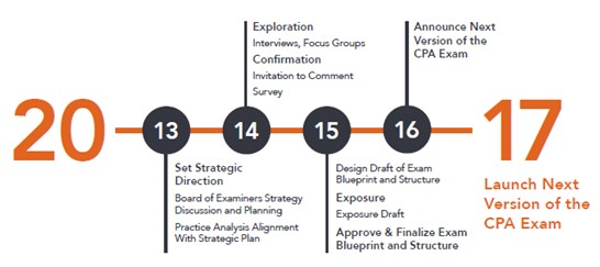 美国CPA决定在考试委员会的监督下,领导发展新版本的美国注册会计师考试。通过一个名叫practice analysis的综合研究项目,利用访谈、焦点小组、调查、评论和意见稿的形式,从股东方面收集信息。再根据此项目所获得的信息内容来决定新版本注册会计师考试的内容,设计以及结构。因此,考试的变化将于2016年正式宣布,并且于2017年推出。