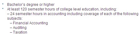 该州只需要满足以下几点:①本科及以上学位;②120个总学分;③24个会计学分,其中必须包括财务\金融会计、审计、税法。