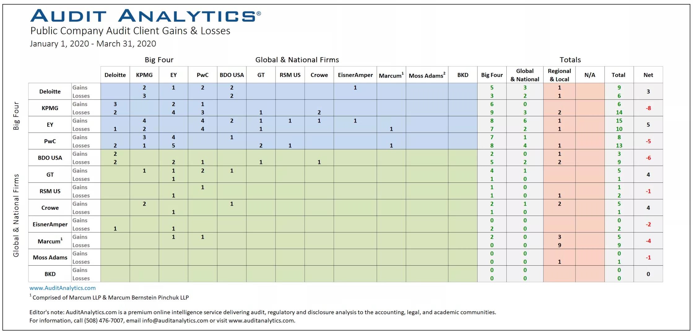 在其他全球和国内公司中,本季度有两家公司的客户净参与度有四家审计客户:Grant Thornton和Crowe。两家公司获得了五个新客户,却失去了一个。