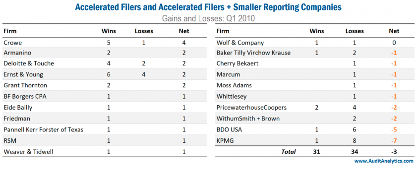 在2020年第一季度,安永、毕马威和德勤在Large Accelerated Filers的净业务量方面有三方面的联系。安永增加了5家,损失了4家,毕马威增加了4家,损失了3家,德勤增加了3家,损失了2家。普华永道该季度Large Accelerated Filers客户数为零。
