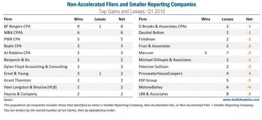 在 Accelerated Filers 中,Crowe高居榜首,在2020年第一季度新增了4家SEC审计客户。对于 Accelerated Filers,有四家公司分别获得了两个新的审计客户:Armanino,德勤,安永和Grant Thornton。