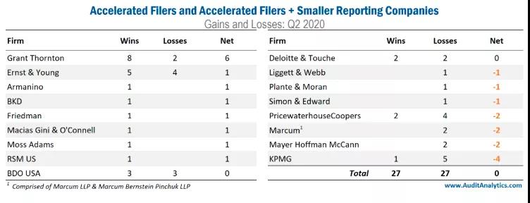 在2020年第二季度的 Accelerated Filers 中,有27家审计公司聘用和27家离任。