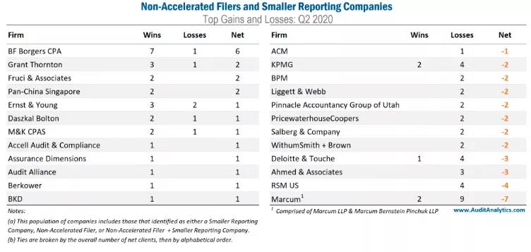 在 Non-Accelerated Filers和 Smaller Reporting Companies 中,有21家公司在2020年第二季度净增加了一家SEC审计客户。