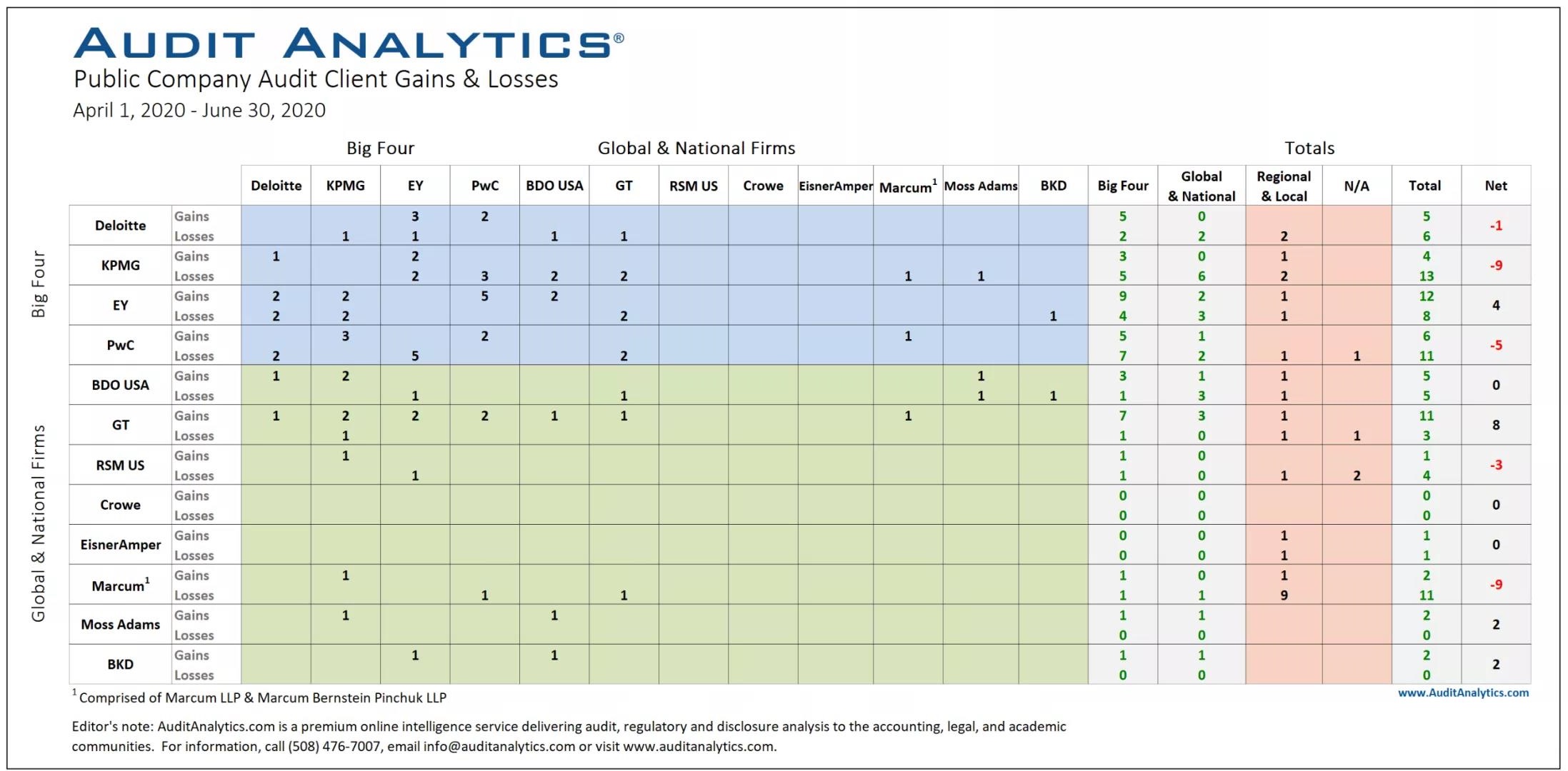 在2020年第二季度,安永获得了三家新的 Large Accelerated Filers 客户,净增加了两家新客户。德勤和Mazars Auditores Consultores Ltda (Chile) 在本季度各新增一个 Large Accelerated Filers 客户。