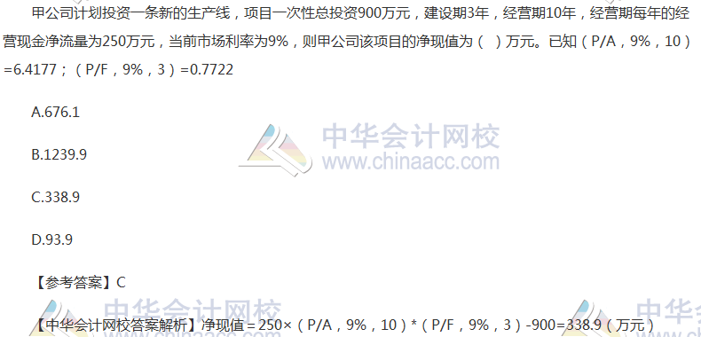 【点评】本题主要考查“净现值”知识点。该题目所涉及知识点在下列正保会计网校(www.fawtography.com)2017年税务师《财务与会计》辅导中均有体现:①《财务与会计》高志谦老师基础班第5章01讲;②陈楠老师强化班第5章01讲;③“梦想成真”系列辅导丛书之《应试指南•财务与会计》第66页单选第9题;④“梦想成真”系列辅导丛书之《经典题解•财务与会计》第49页例题1;⑤考试中心开通的模拟试题(三)单选第7题、预测试题(二)单选第6题。