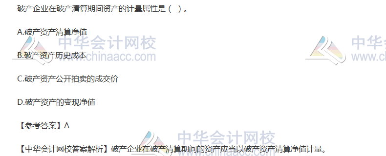 【点评】本题主要考查“企业破产清算的计量属性”知识点。该题目所涉及知识点在下列正保会计网校(www.fawtography.com)2017年税务师《财务与会计》辅导中均有体现:①《财务与会计》高志谦老师基础班第21章01讲;②陈楠老师强化班第21章01讲;③“梦想成真”系列辅导丛书之《应试指南•财务与会计》第376页例题1;④“梦想成真”系列辅导丛书之《经典题解•财务与会计》第318页例题1。
