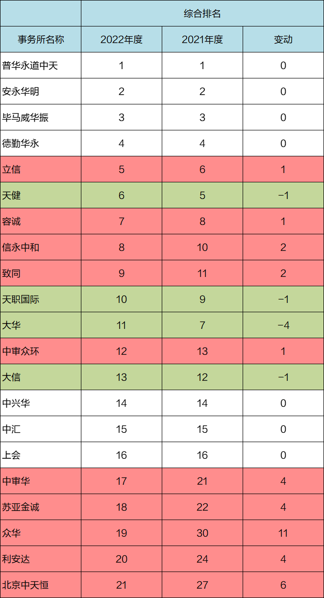 国际四大的排名鲜少变动,但是内资所的排名变动每年都很大。 立信和天健成为内资所的榜首,这几年这两家事务所几乎是轮流成为内资所的头牌,他们的实力确实是很强悍! 前21名事务所变动对比如下: