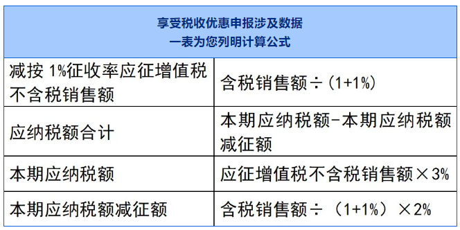 小规模纳税人发生增值税应税销售行为,合计月销售额超过10万元的,减按1%征收率征收增值税的销售额应填写在《增值税及附加税费申报表(小规模纳税人适用)》“应征增值税不含税销售额(3%征收率)”相应栏次,对应减征的增值税应纳税额按销售额的2%计算填写在《增值税及附加税费申报表(小规模纳税人适用)》“本期应纳税额减征额”及《增值税减免税申报明细表》减税项目相应栏次。适用3%征收率销售收入减按1%征收政策的增值税小规模纳税人,销售额的计算公式为:销售额=含税销售额/(1+1%)。
