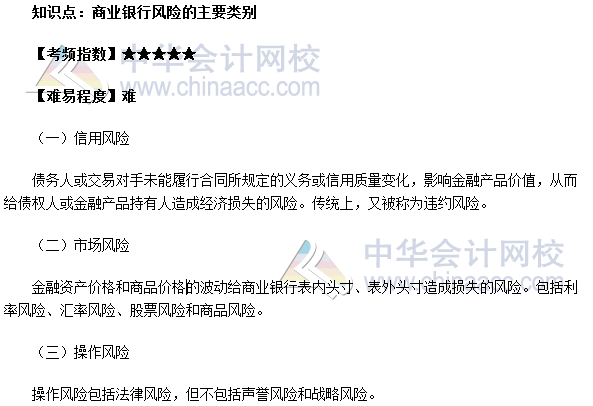 2017年银行业中级职业资格上半年考试时间为6月3日-6月4日。如何巩固知识,提高备考效果,是每一位考生需要考虑的问题。正保会计网校为考生精心整理了2017年银行业中级职业资格考试《风险管理》第一章风险管理基础中“商业银行风险的主要类别”相关知识点供大家参考,希望对广大考生有所帮助,祝大家学习愉快,梦想成真!