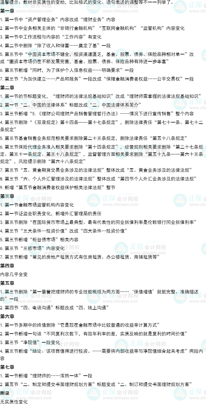 2023年《个人理财》(初级)的教材已经发布,正保会计网校第一时间对比了新旧教材的变化情况。总体来看,教材变化较大的章节是第一章、第二章、第四章,尤其是第四章,内容几乎全部做了调整。