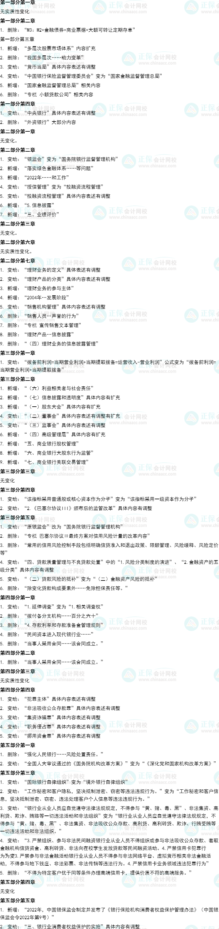从章节来看,主要的变化集中在第二部分第七章“理财业务的定义”变动,新增“理财产品的分类”、“理财业务的参与主体”、“风险监管要求”;第三部分第二章新增“利益相关者与社会责任”、“银行公司治理的组织架构”有变动和新增内容、新增“商业银行股权管理”、“商业银行大股东行为监管”、“商业银行关联交易管理”;第三部分第四章“《巴塞尔协议III》颁布后的监管改革”有变动;第三部分第五章“金融资产的五级分类”有变动;第四部分第四章“金融犯罪及刑事责任”的具体内容表述有调整。