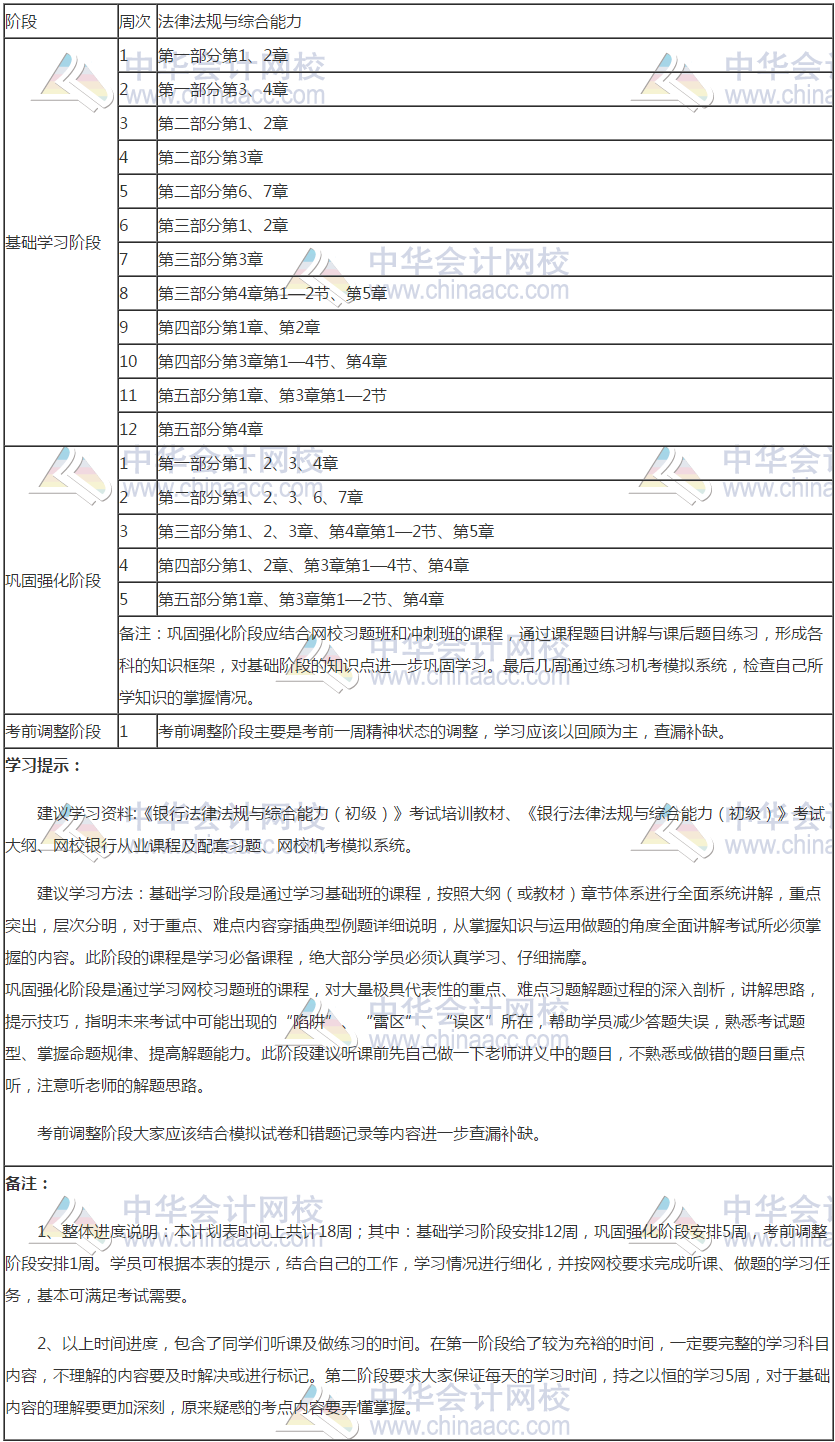 2019下半年银行初级职业资格备考开始,10月27、28日考试。网校特为大家大概制定了一份18周的学习计划表,大家可以根据自己的时间、自己基础知识的薄弱点,稍做调整,变成你自己的完美学习计划,加油!