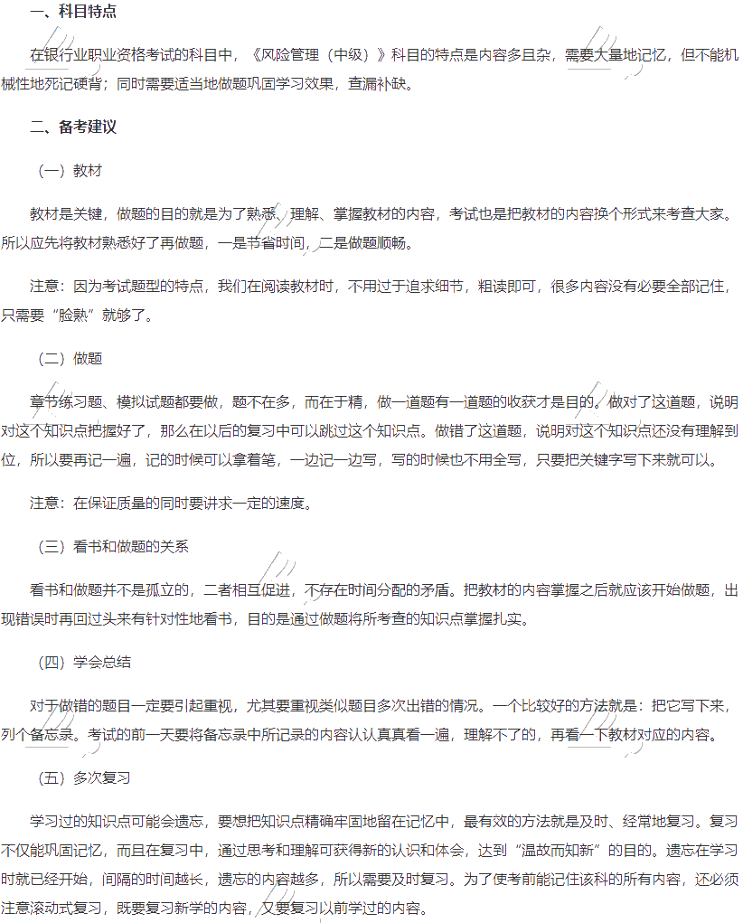 以下是正保会计网校为大家整理的银行业职业资格考试《风险管理(中级)》科目特点分析以及备考建议,供考生参考。祝大家备考顺利、早日梦想成真!
