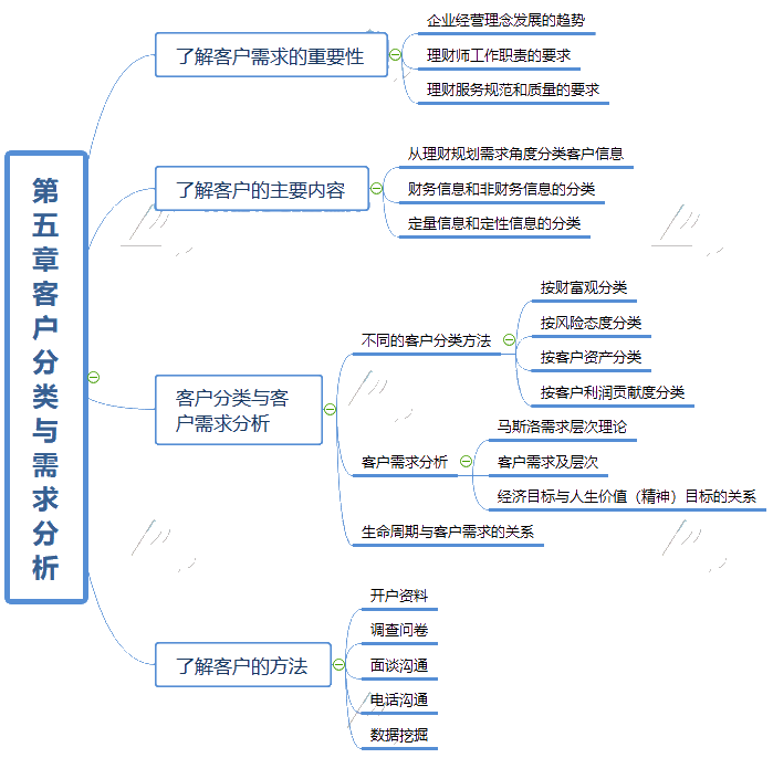 以下是2020年银行初级《个人理财》第五章“客户分类与需求分析”思维导图: