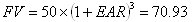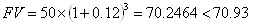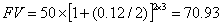 假如,将50元进行投资,年利率为12%,每半年计息一次,3年后的终值是多少?