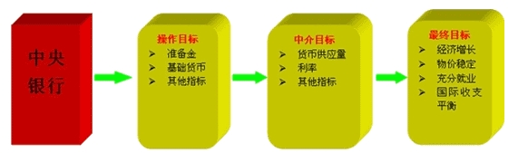 制定和实施货币政策,首先必须明确货币政策最终要达到的目的,即货币政策的最终目标。中央银行通过货币政策工具操作直接引起操作目标的变动,操作目标的变动又通过一定的途径传导到整个金融体系,引起中介目标的变化,进而影响宏观经济运行,实现货币政策最终目标(见图2-1)。