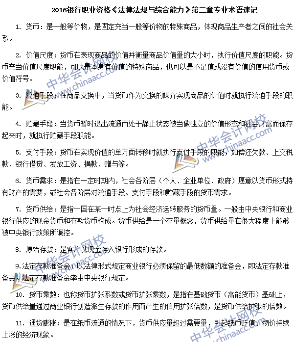 2016年银行初级职业资格备考正在火热进行中,为帮助考生们高效备考,正保会计网校教学专家根据丰富的教学经验,整理了银行初级职业资格考试各考试科目的专业术语速记,希望增强考生对知识的理解。下面是《法律法规与综合能力》第二章专业术语速记内容。